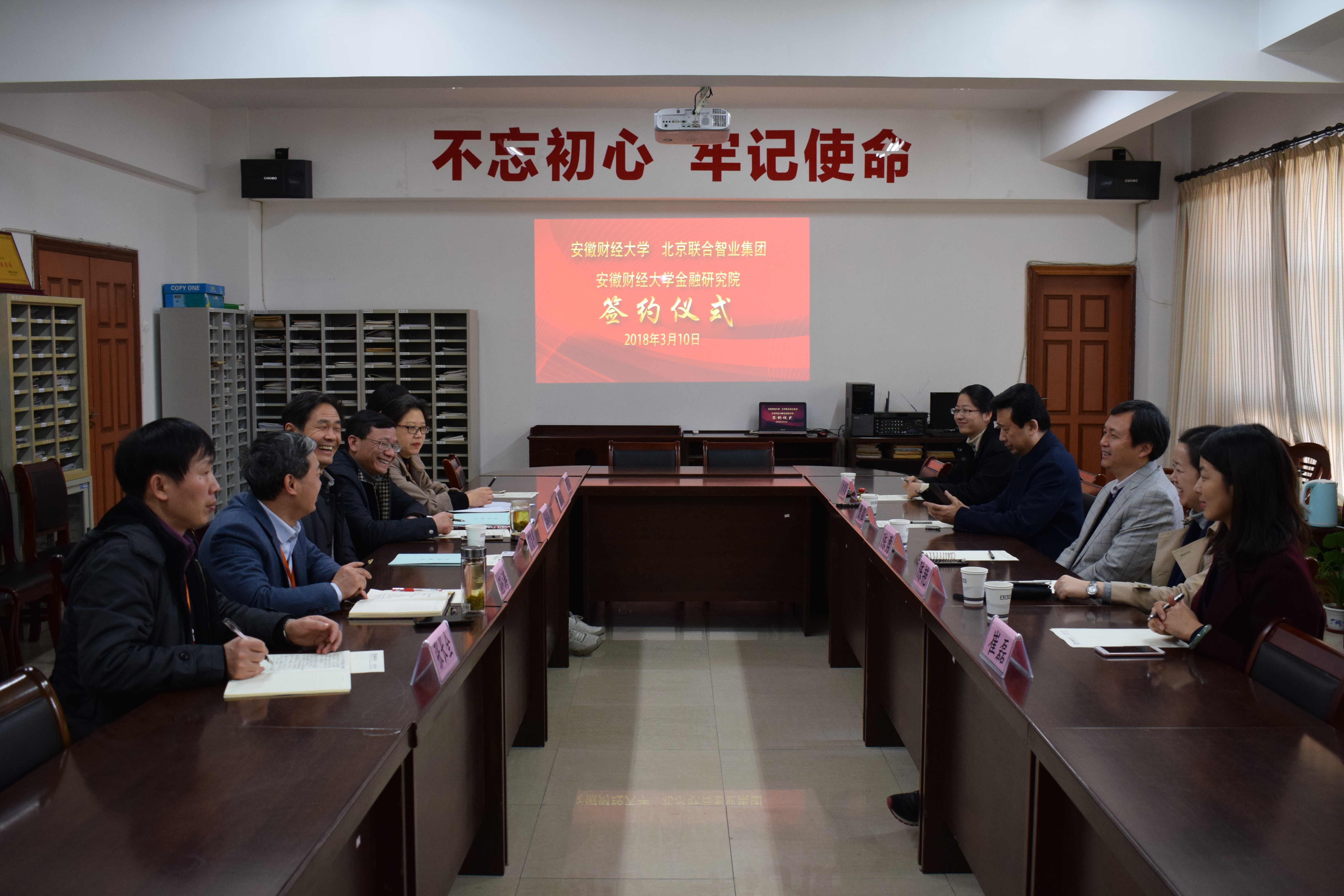 3月10日下午,我校与北京联合智业集团联合组建安徽财经大学金融研究院签约仪式在金融学院会议室举行。校党委书记、校长丁忠明,我校校友、北京联合智业集团董事长陈勇出席签约仪式并共同签署合作协议。