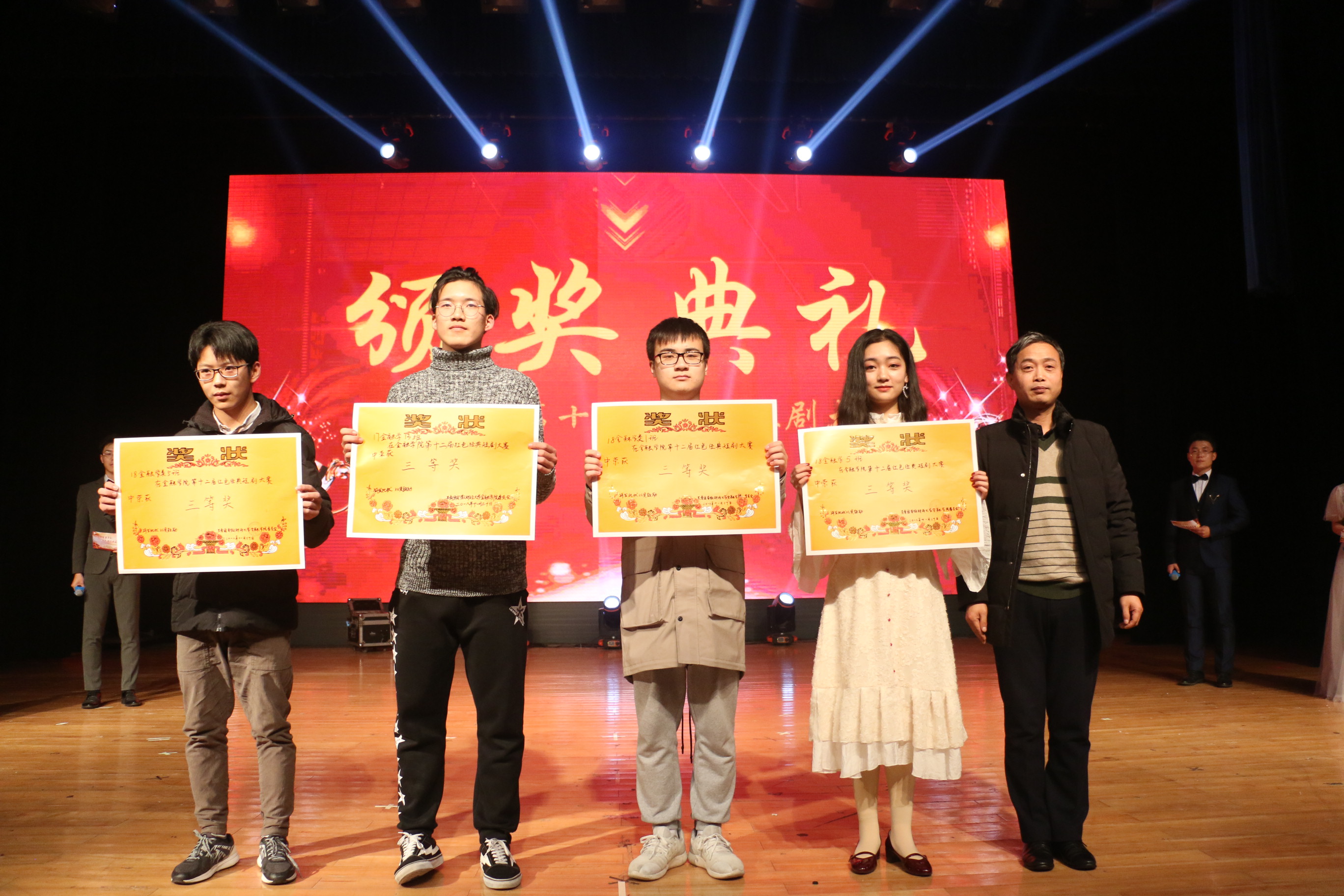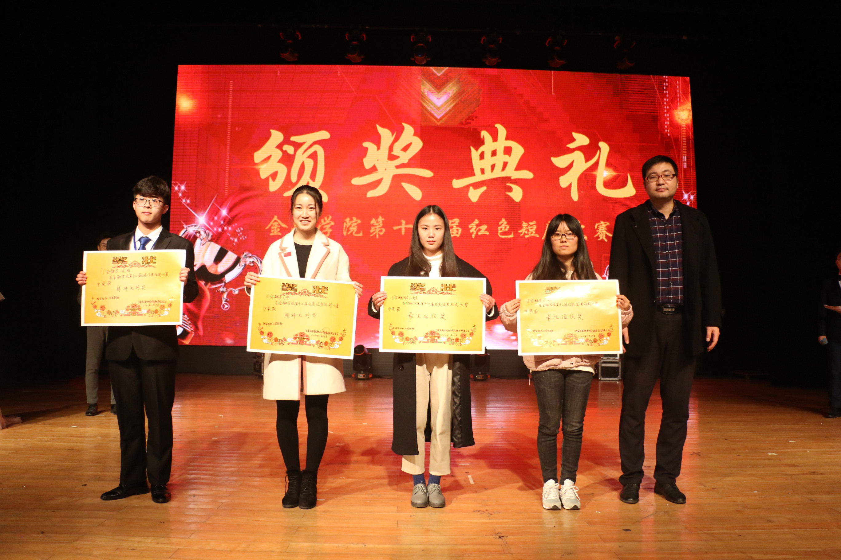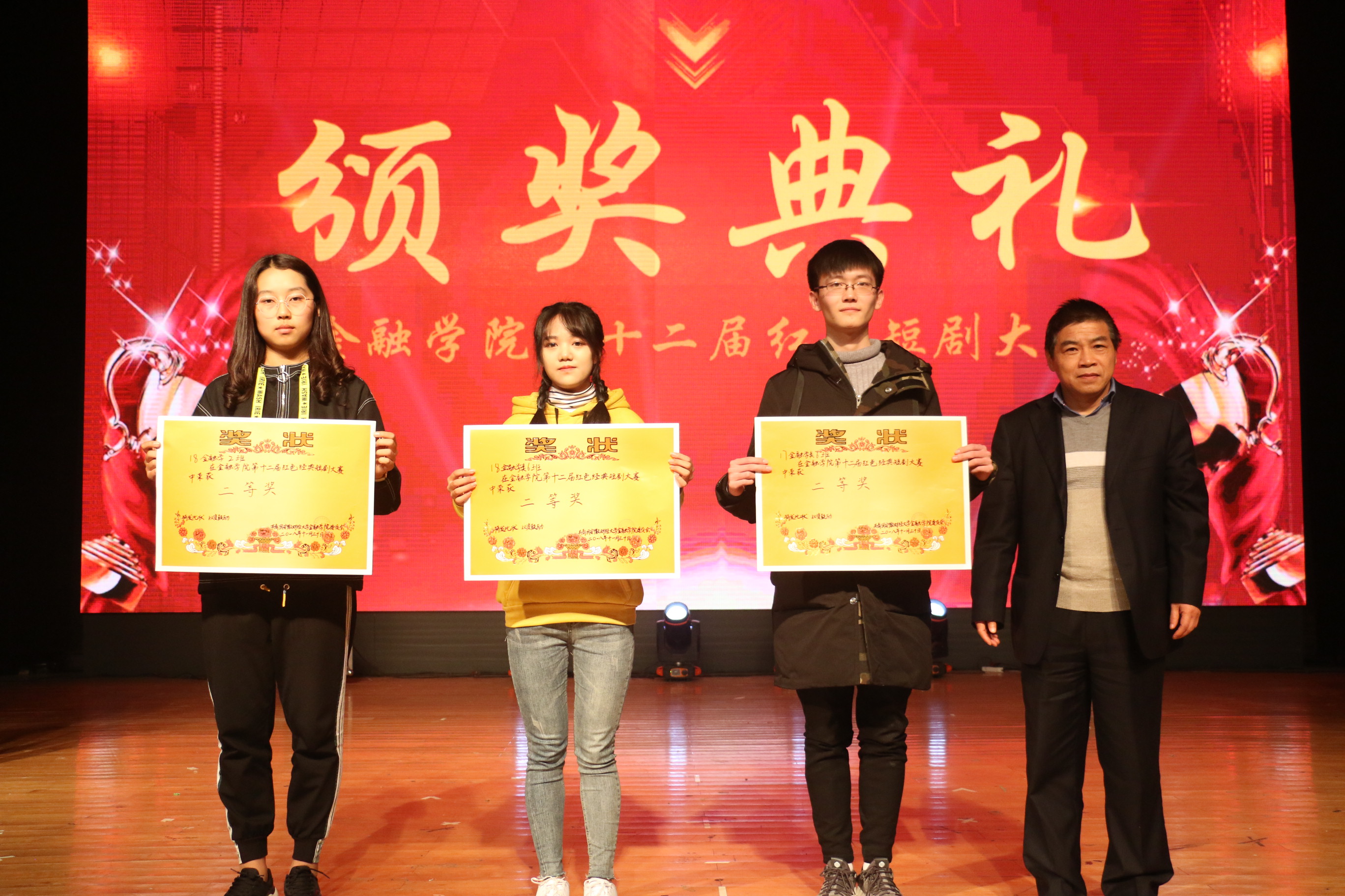 经过激烈角逐, 18金类4班《五四风潮》获一等奖; 18金融2班《孝子?》、17金类6班《梦回抗日年代》、18金类6班《黎明前的抉择》获二等奖; 18金融5班《饭局》、18金类1班《晨曦》、18金类5班《送水》、17金融13班《祖国不会忘记》获三等奖; 18金类6班刘浩宇获最佳男演员、18金类4班武楠楠获最佳女演员;精神文明奖17金融14班、18金融7班;最佳组织奖18金类3班、18金融6班;最佳人气奖18金类6班。