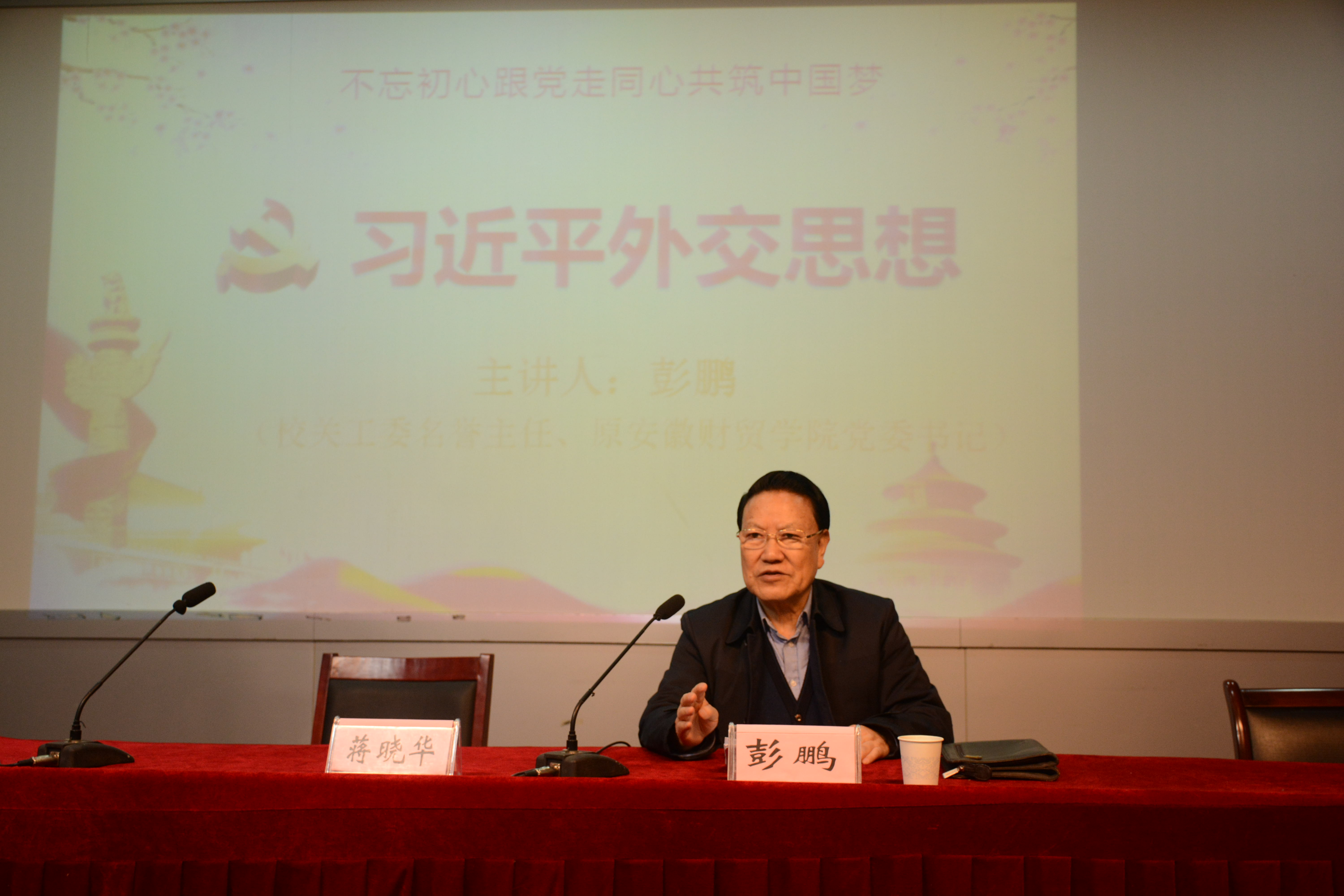 3月13日下午,原安徽财贸学院党委书记、校关工委名誉主任彭鹏在东校区图书馆报告厅应邀为金融学子作了一场题为“习近平外交思想”的专题报告。报告会由院党委书记蒋晓华主持。