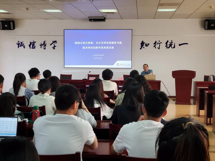 5月16日下午,应金融学院邀请,上海证券交易所市场发展部安徽区域主任刘瀚作题为“拥抱全面注册制,充分发挥直接融资功能,服务科技创新和高质量发展”的专题报告。报告会由院党委副书记颜晓旭主持,学院部分研究生参加报告会。