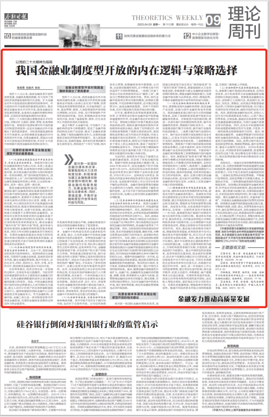 《金融时报》2023年4月3日刊发我院陈若愚副教授理论文章《我国金融业制度型开放的内在逻辑与策略选择》。《金融时报》由中国人民银行主管,是中国人民银行、中国银行保险监督管理委员会、国家外汇管理局指定披露重要信息媒体,证券市场信息披露媒体。本成果是陈若愚副教授主持的国家社会科学基金青年项目“中国金融业扩大开放与宏观审慎政策的国际协调研究(21CJY074)”阶段性成果。