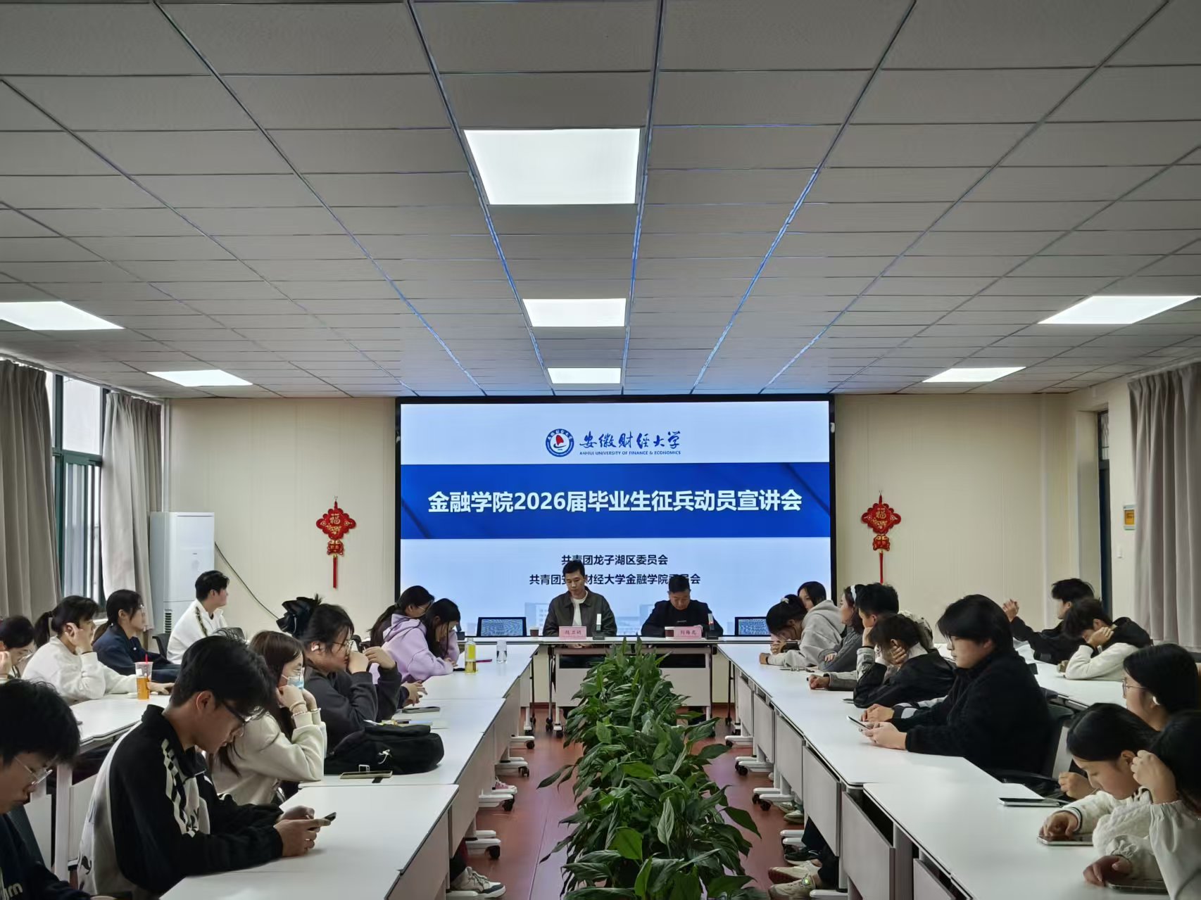 为积极响应国家号召,激发金融学子投身国防、报效祖国的热情,扎实做好2026年度大学生征兵工作,我院于10月29日下午举办了2026届毕业生征兵动员宣讲会。本次宣讲会特邀蚌埠市龙子湖区退役军人事务局、区直机关团工委副书记刘海龙以及我校学生处学生资助管理中心陆卫词老师作为主讲嘉宾,学院征兵工作负责人、毕业班学生及有参军意愿的各年级学生参加了此次宣讲会。
